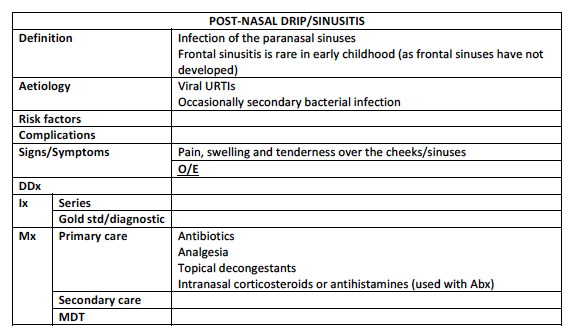 What are the symptoms, signs, investigations and management for Post–Nasal Drip/ Sinusitis?