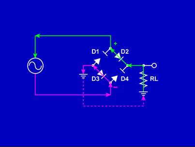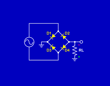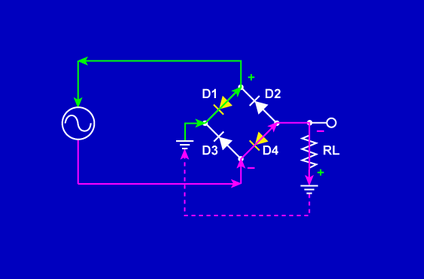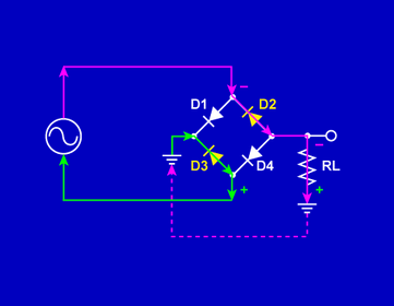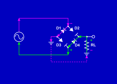 When the junction of D1 and D2 is negative, diodes D2 and D3 are forward-biased. Current flows through D2 and the load to ground. From ground, current flows through D3 and back to the source, completing the circuit. The bridge output remains negative in relation to ground.