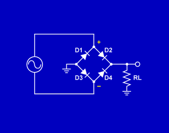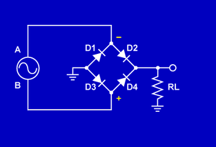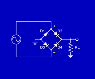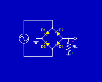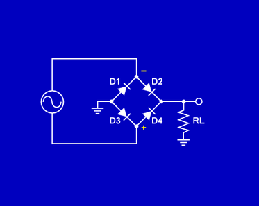 With a positive voltage at the junction of D1 and D2, diodes D1 and D4 are forward-biased. Current flows through D4 and the load to ground. From ground, current flows through D1, completing the path.