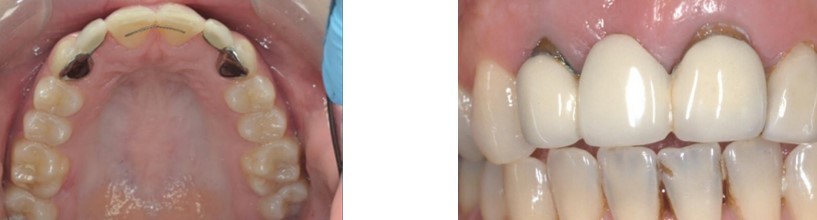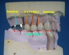 “A prosthesis which replaces a missing tooth or teeth and is attached to one or more natural teeth (or implants)”