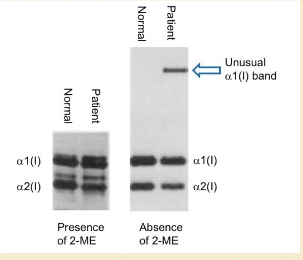 inappropriate disulphide bonds between the two α1(I) chains in the helix, resulting in a cross linked polypeptide chain