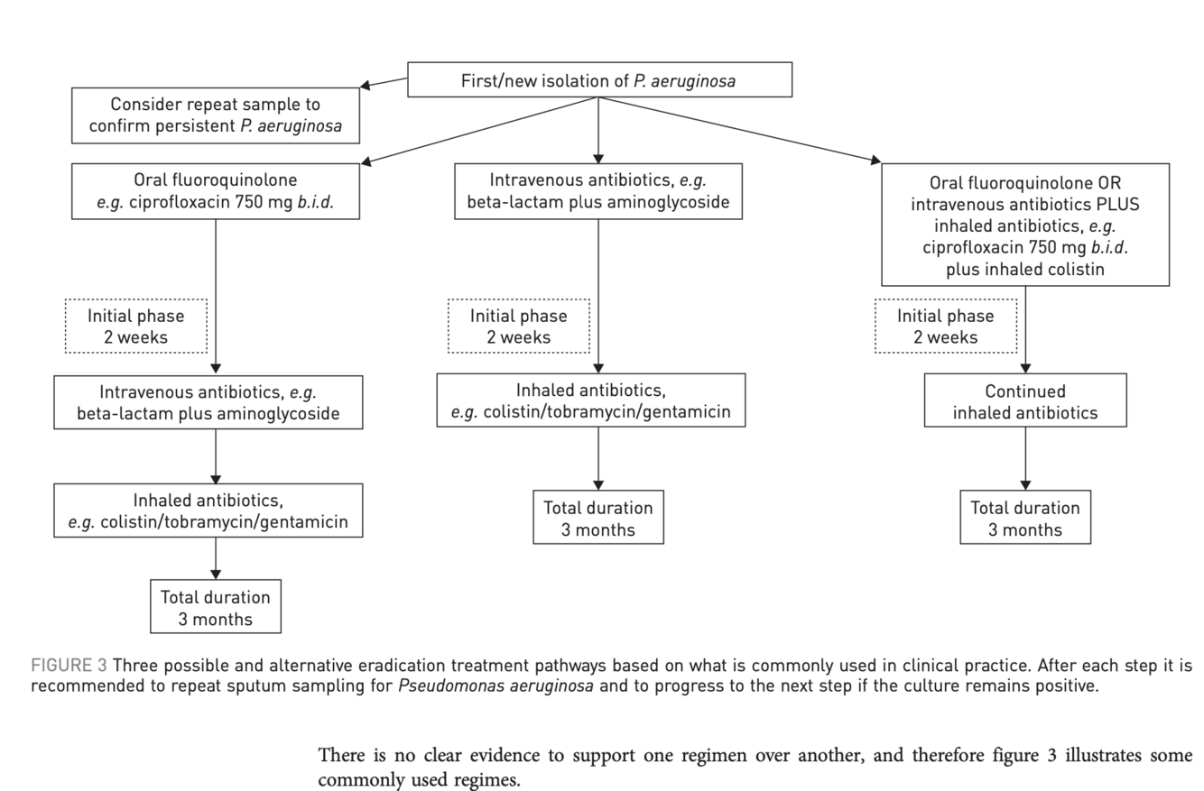 - if lack of response or intolerance, swap to long term inhaled Abx, or swap to long-term targeted oral Abx, or combine oral & inhaled Abx