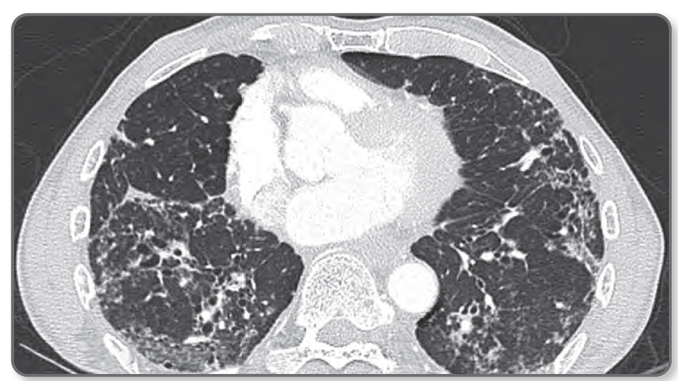 > (advanced/fibrotic - restrictive pattern FEV1/FVC > 70% from scarring, atelectasis)