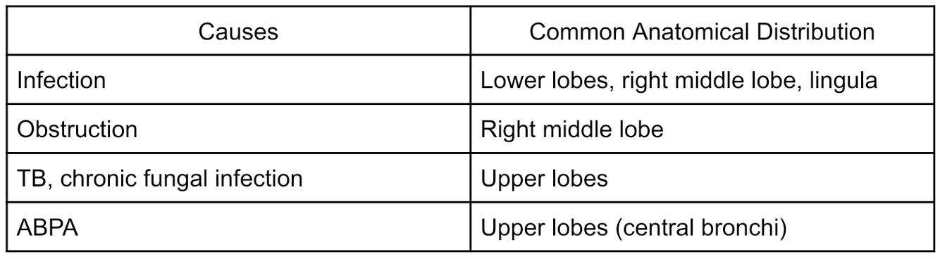 Postulate anatomical distribution of bronchiectasis with cause or associated conditions