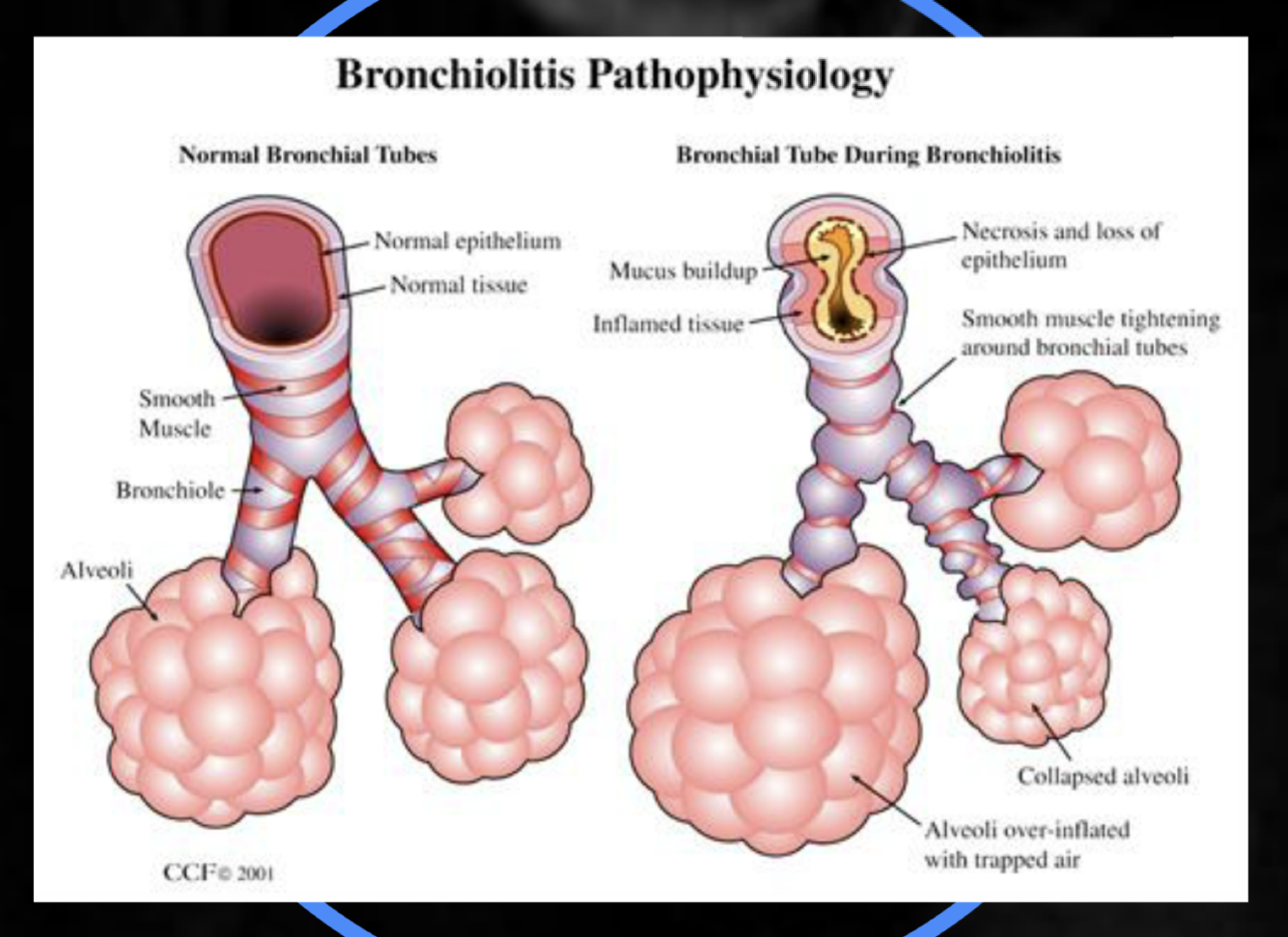 mucus buildup and inflamed tissue. causes necrosis and loss of epithelium. constriction. smooth muscle tightens around bronchiole tubes. alveoli collapse