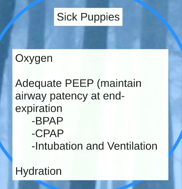 adequate PEEP. Maintain airway patency at end expiration. prevents airway collapse. gives inspiratory pressure and maintains resistance on airway to prevent collapse.