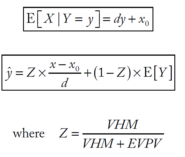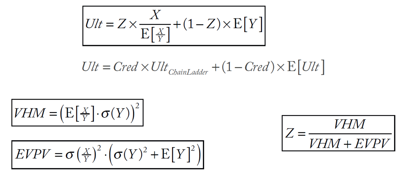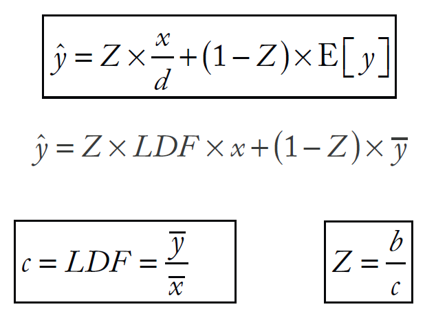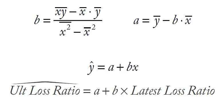 Ultimate losses are estimated as expected unobserved loss plus actual observed loss, L(x) = a + x → b = 1
