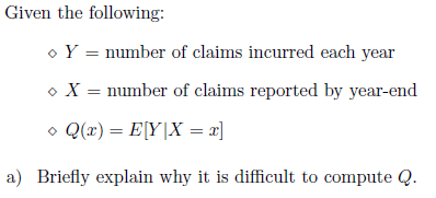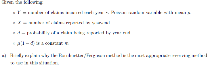In the situation described above, X is a binomial random variable with parameters (y, d). Since Y is Poisson distributed, we have a Poisson- binomial mixed process. Thus, R(x) = μ(1 − d). Since R(x) does not depend on the number of claims already reported, the Bornhuetter/Ferguson method is the optimal method to use