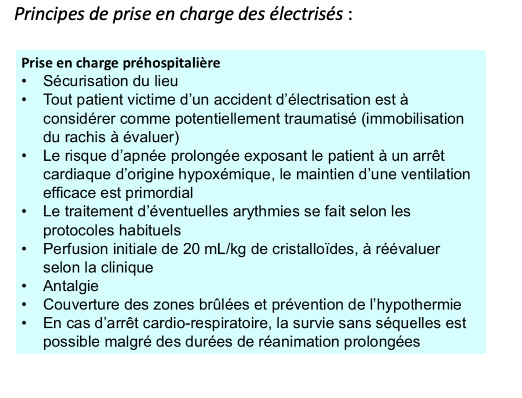 Qu’elles sont les principes de prise en charge de la personne électrisé avec brûlure