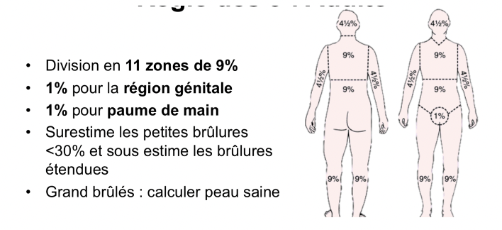 On utilise la règle des 11 zones de 9%. Une surface de plus de 10% est considéré comme une brûlure grave.