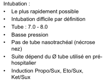 Inhalation certaine : dépôts carbonisés dans l’oropharynx, expecto noir, explosions avec brûlures tête – cou – thorax,toux – stridor – wheezing – dysphonie