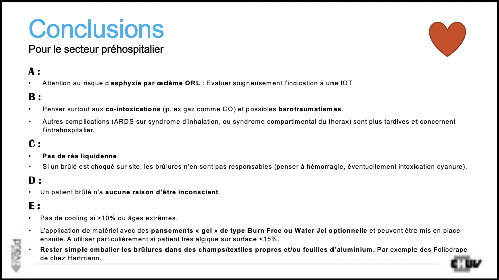 Le patient brûlé est potentiellement un polytraumatisé. Le pronostic vital à très court terme n’est pas influencé par les brûlures mais par le risque d’asphyxie et les lésions traumatiques associées. Le grand brûlé ne devient instable qu’après 4h-6h.