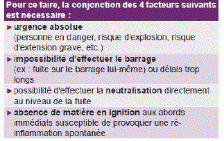 Dans certains cas qui doivent rester très exceptionnels et après concertation entre le COS et le responsable du Gaz de France sur place, il peut être nécessaire de procéder à l’extinction alors même que la fuite n’est pas encore arrêtée.