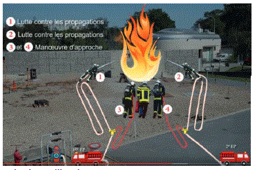 Quand ces 4 conditions sont réunies, il s’agit d’accompagner l’agent GRDF en le faisant encadrer par 2 sapeurs-pompiers manœuvrant chacun une lance en jet diffusé de protection, jusqu’à ce qu’il soit suffisamment près de la flamme pour la souffler et neutraliser la fuite. En cas de fuite enflammée sur conduite moyenne pression, des lances (en jet diffusé) supplémentaires, placées légèrement en retrait, sont nécessaires pour la protection des porte-lance engagés au plus près du foyer.