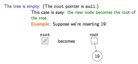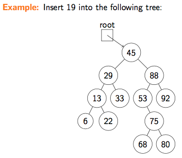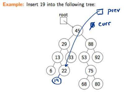 In the attached example, where would prev and curr be when inserting 19 into the BST