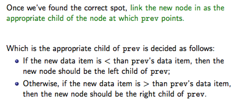 In a BST insertion, after we have determined the correct spot using prev and curr, what is the next step?