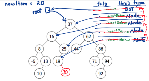 Draw the table diagram of adding 20 into the following recursive insertion method for a BST