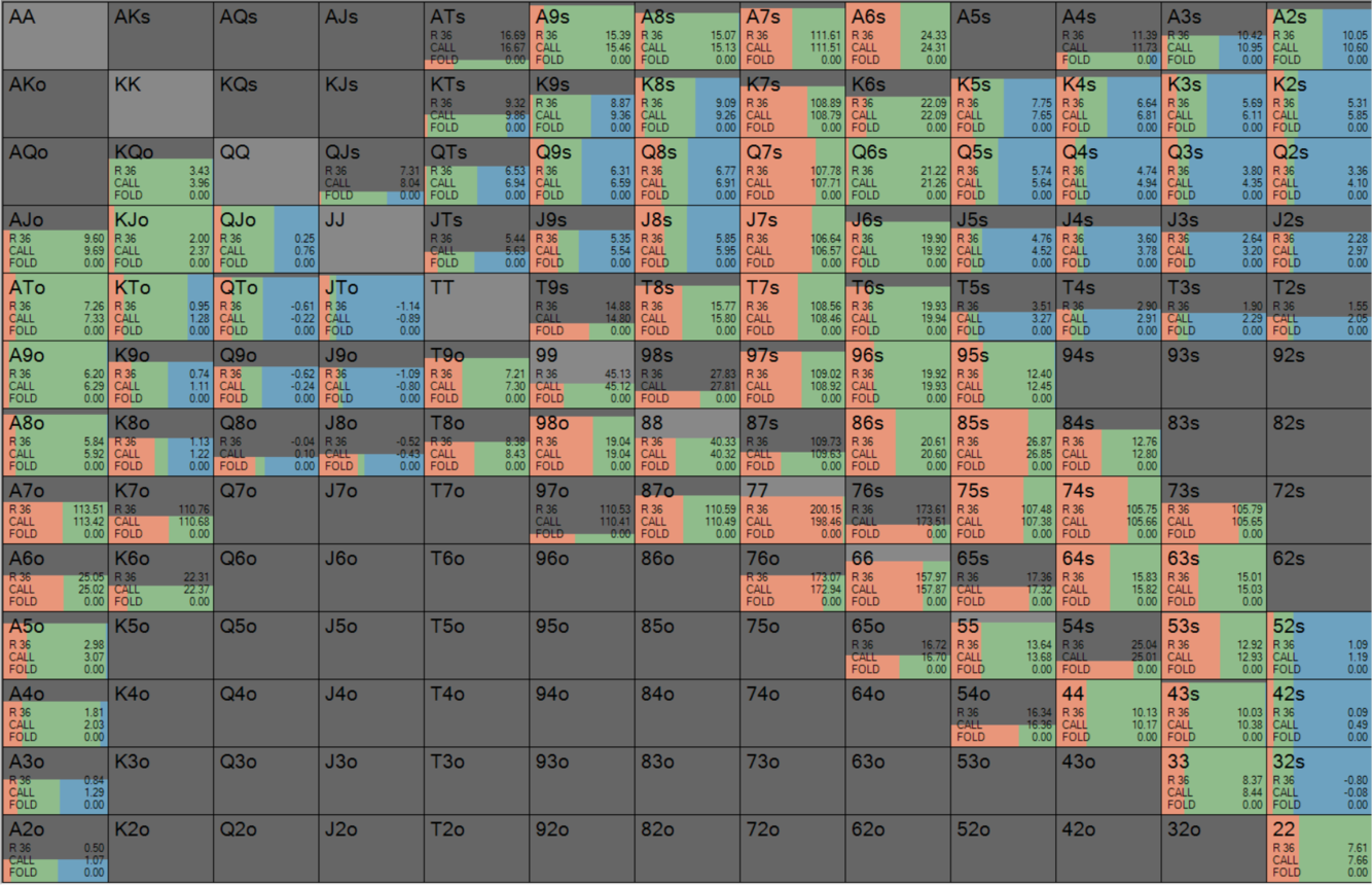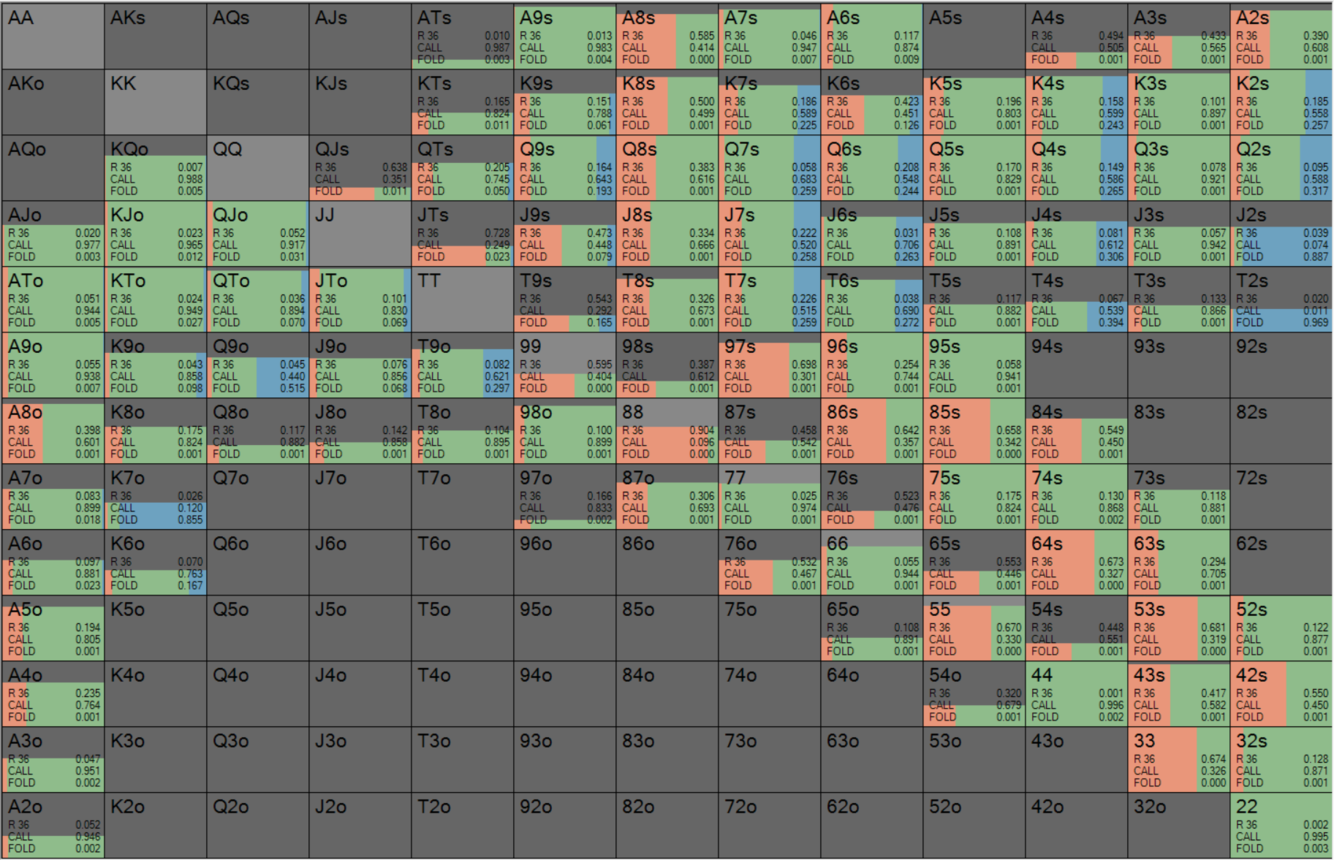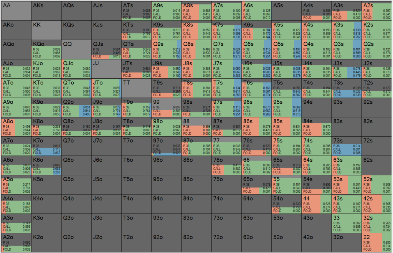 (All combo’s without a spade are mixing call and fold 50/50. With spade raises 30%, call 70%)