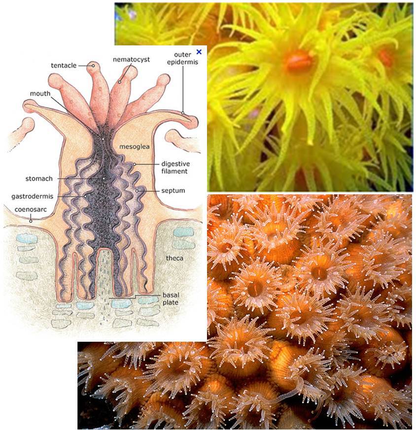 FYI: A polyp in zoology is one of two forms found in the phylum Cnidaria, the other being the medusa. Polyps are approximately cylindrical in shape and elongated at the axis of the vase-shaped body. In solitary polyps, the aboral end is attached to the substrate by means of a disc-like holdfast called the pedal disc, while in colonies of polyps it is connected to other polyps, either directly or indirectly. The oral end contains the mouth, and is surrounded by a circlet of tentacles.