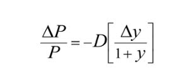 ΔP = the dollar change in price P = price of a bond ΔP/P= % price change of bond (-D) = the duration in terms of years used as a negative value ∆<sub>y</sub> = the % change in interest rates. If they go down this number should be negative 1+y = 1 + yield to maturity