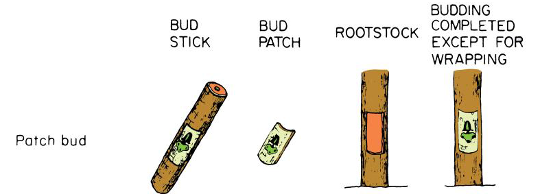 a rectangluar patch of bark is completely removed from the rootstock and replaced with a patch of bark of the same size containing a bud of the cultivar to be propagated