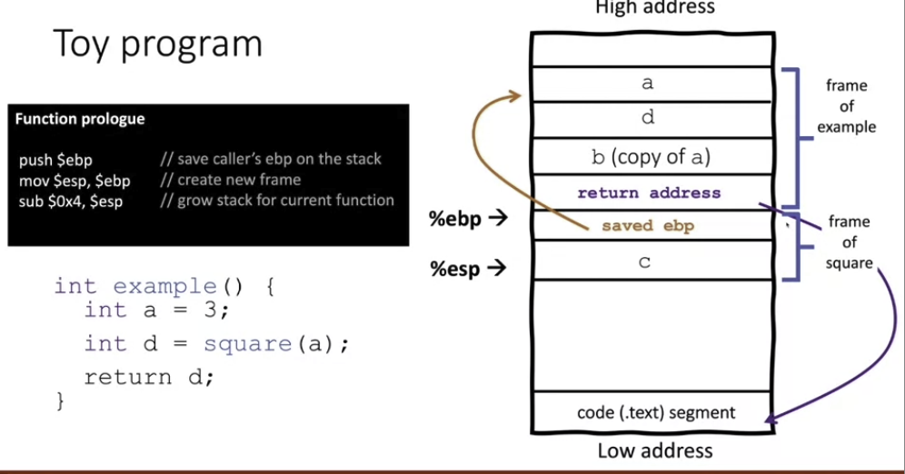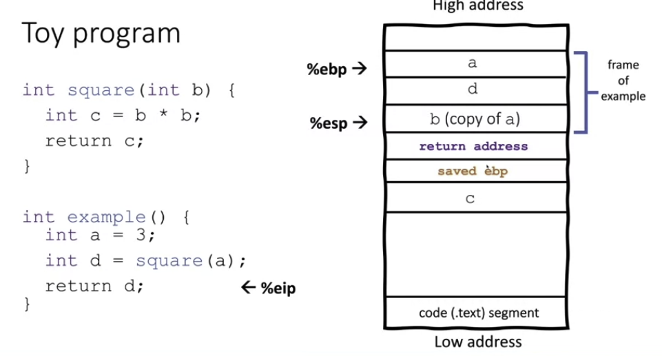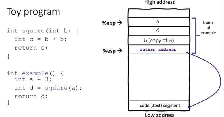 then, when example calls square, a copy of the argument passed to square is pushed onto the stack. then the return address. this is now the %esp (stack pointer) which keeps getting decremented because it points to the top of the stack.