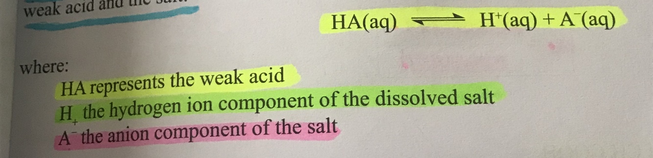 In a buffer solution, what does A- represent?