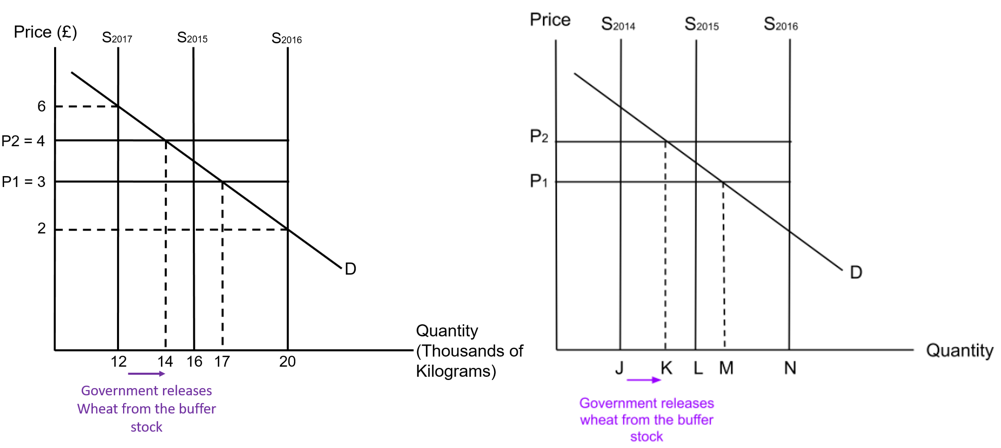 The government is operating a buffer stock scheme with a floor price of P1 and a ceiling price of P2. In 2016, the government bought up 3000 kilograms of wheat to add to its stockpile at a price of £2.