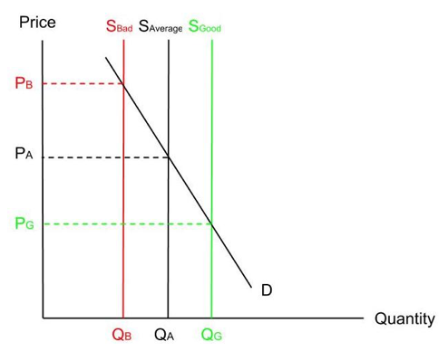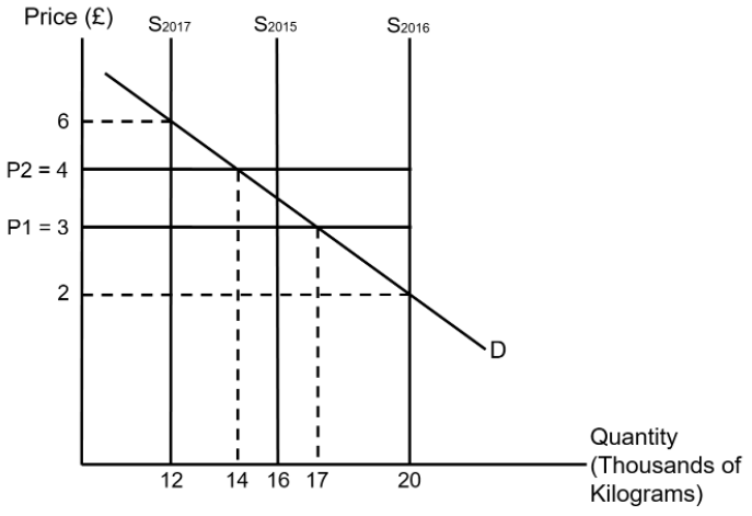 Supply is perfectly inelastic for all three harvests - each supply curve is shown by a vertical line. This means that any change in price will have no impact on quantity supplied.