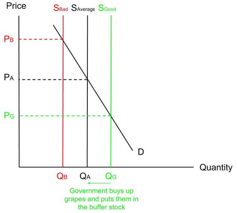 What will happen to the equilibrium price of grapes when the government buys up the grapes to put in the buffer stock?