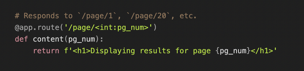Variable rules allow a Flask app to respond to dynamic URLs. Variable sections of a URL can be indicated by angular brackets and an optional converter: <converter:variable_name>. These variable parts will then be passed to the view function as arguments.</converter:variable_name>
