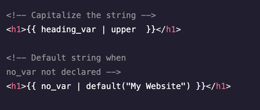 Filters are applied to template variables and perform a small focused action. Filters follow a variable and are separated by the pipe, |, character. This syntax works inside expression {{ }} and statement {% %}delimiters.