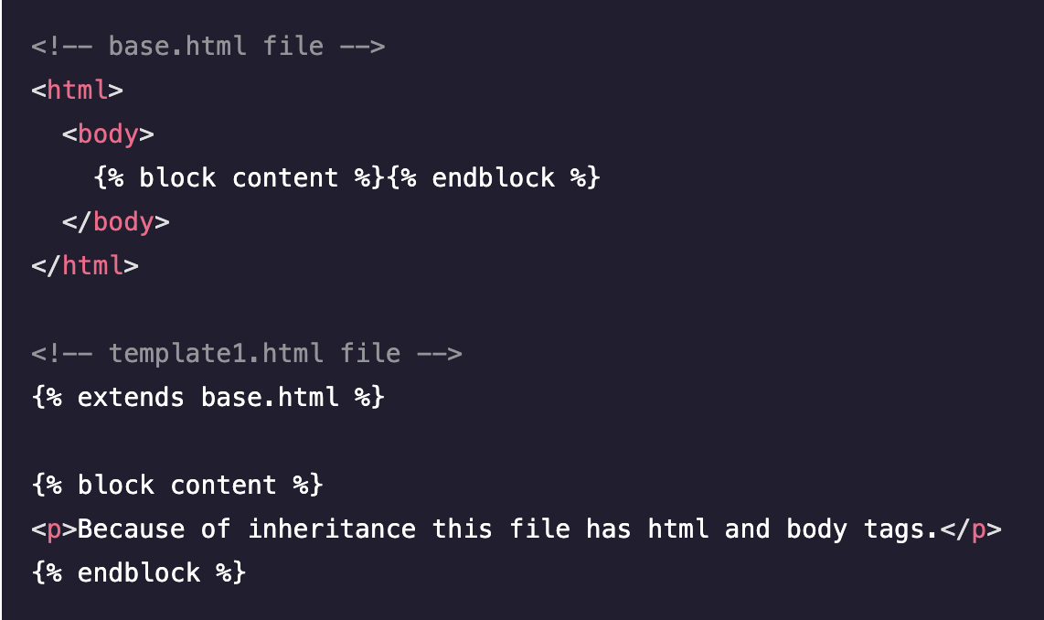 The block statement is used to identify the location in each file to establish inheritance. In the parent file {% block identifier %} and {% endblock %} are used to identify what line to substitute inherited content. In the child file {% block identifier %} and {% endblock %} surround the content to be substituted.
