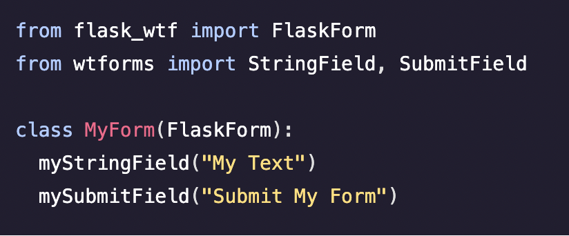 Inheriting from the FlaskForm class gives an app defined class the functionality such as template representation, gathering data and providing validation. Used in conjunction with WTForm Fields, FlaskForm functionality gives an easy path over how forms are displayed and how valid data is collected within an application. FlaskForm is imported through the flask_wtf module.