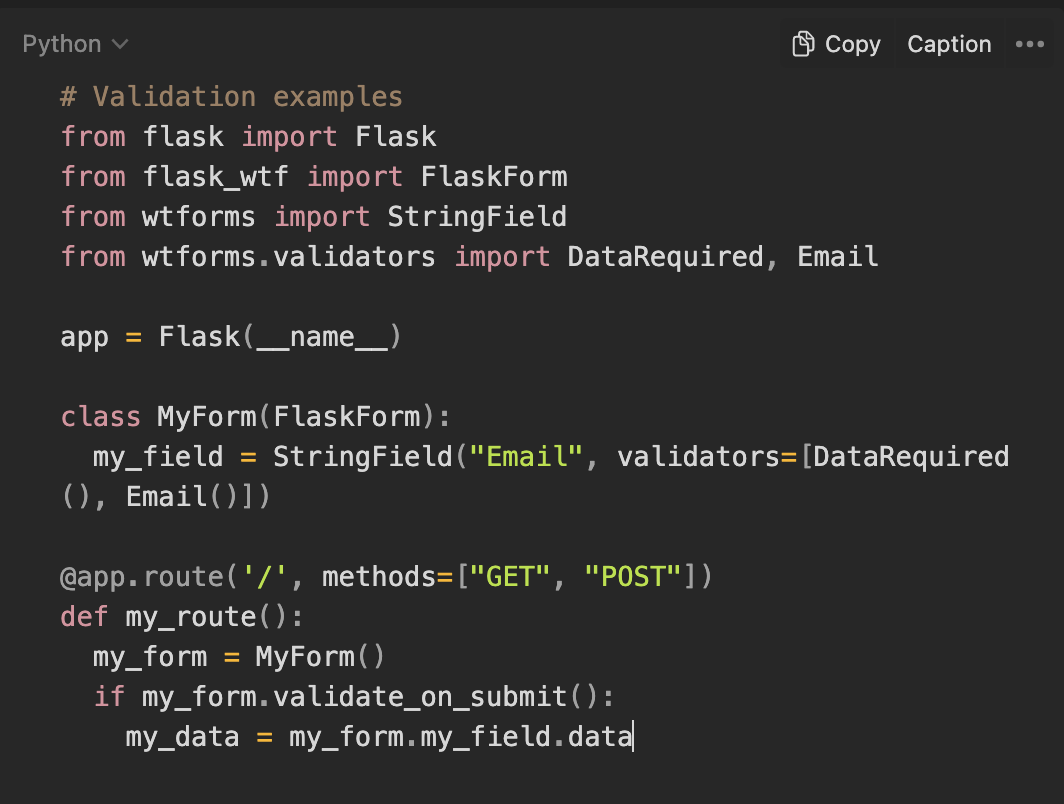 In a web form, validators are used to identify the fields that require specifc data or formats upon submitting the form. This can be as simple as requiring data to be present, to more specific formats such as dates, phone numbers and email addresses. Form field validators can be added to the field’s instantiation and are imported from the wtforms.validators module. Check the WTForms Validators documentation for more information.