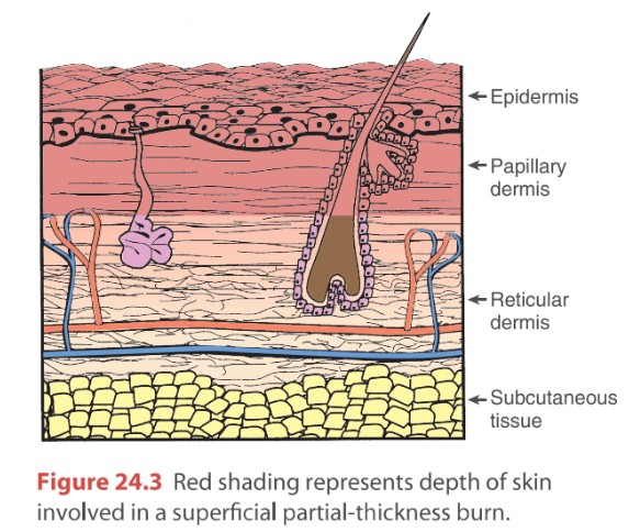 What is a damaged in a superficial partial-thickness burn?