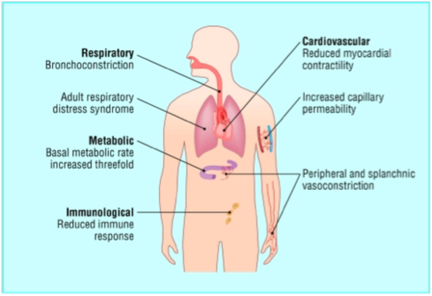 Cardiovascular changes: capillary permeability is increased >> loss of intravascular protein >> fluid in interstitial compartment >> myocardial contractility decreased >> hypotension occurs >> possible end organ hypoperfusion