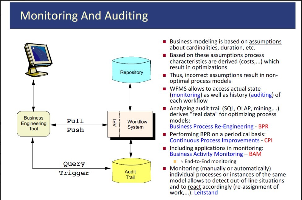 Auditing bezieht sich auf die Speicherung der gesamten Prozesshistorie im sogenannten Audit Trail. Dieser enthält unter anderem Zeitstempel, ausgeführte Aktivitäten, Reihenfolgen und beteiligte Ressourcen. Dadurch erhält man reale, messbare Daten über das tatsächliche Prozessverhalten.