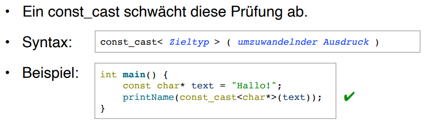In C++ dient der const_cast dazu, die Konstanz eines Objekts aufzuheben oder wiederherzustellen.