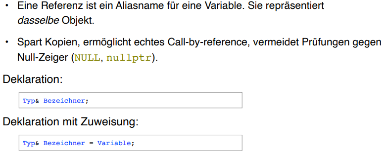 Eine Referenz ist ein Aliasname für eine Variable. Sie repräsentiert
