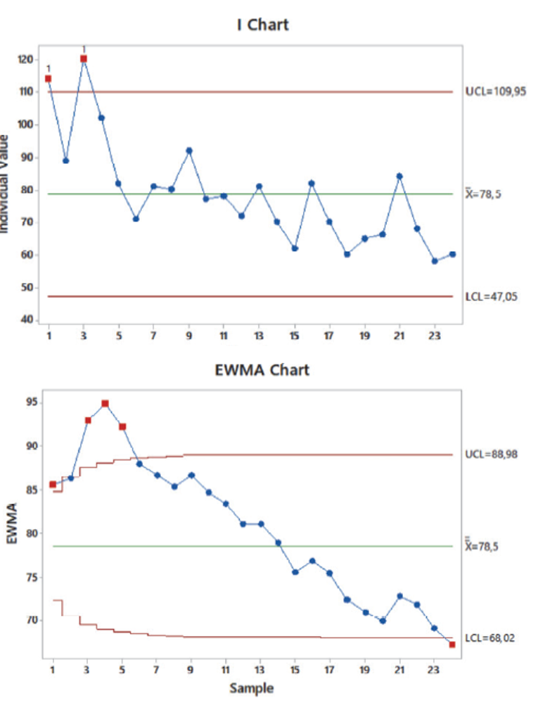 EWMA = Exponential Weighted Moving Average (Hoe recenter, des te zwaarder gewogen.)