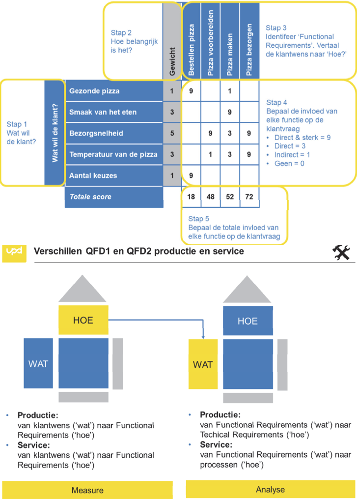 QFD = Quality Function Development, tool voor inzichtelijk krijgen wat de klant belangrijke vindt en hoe je dat kan implementeren.