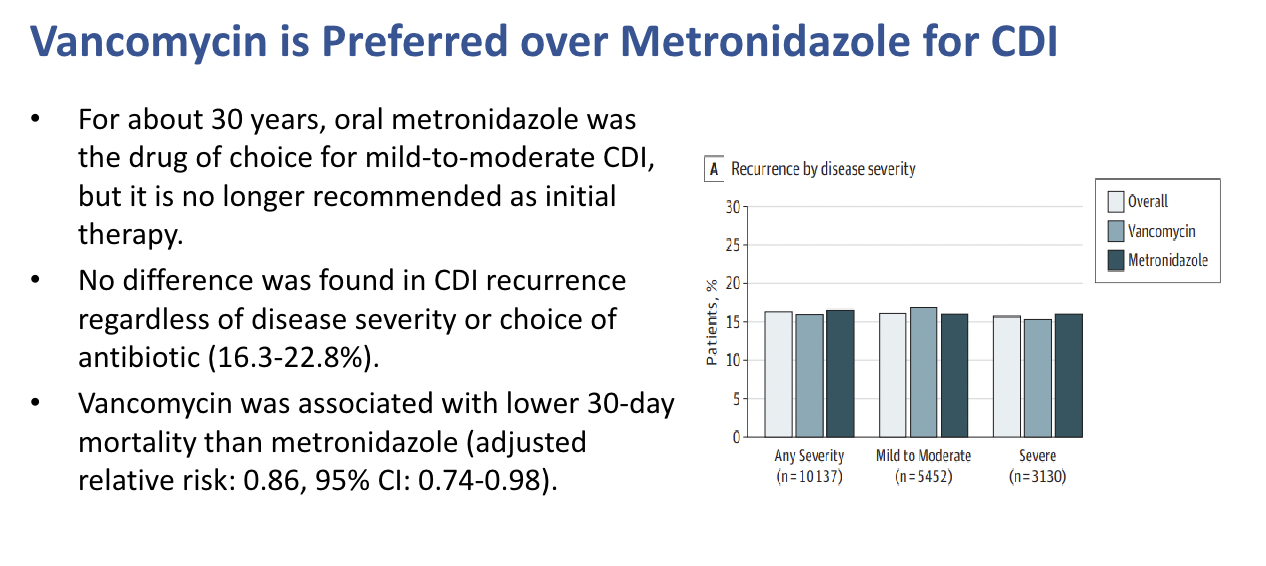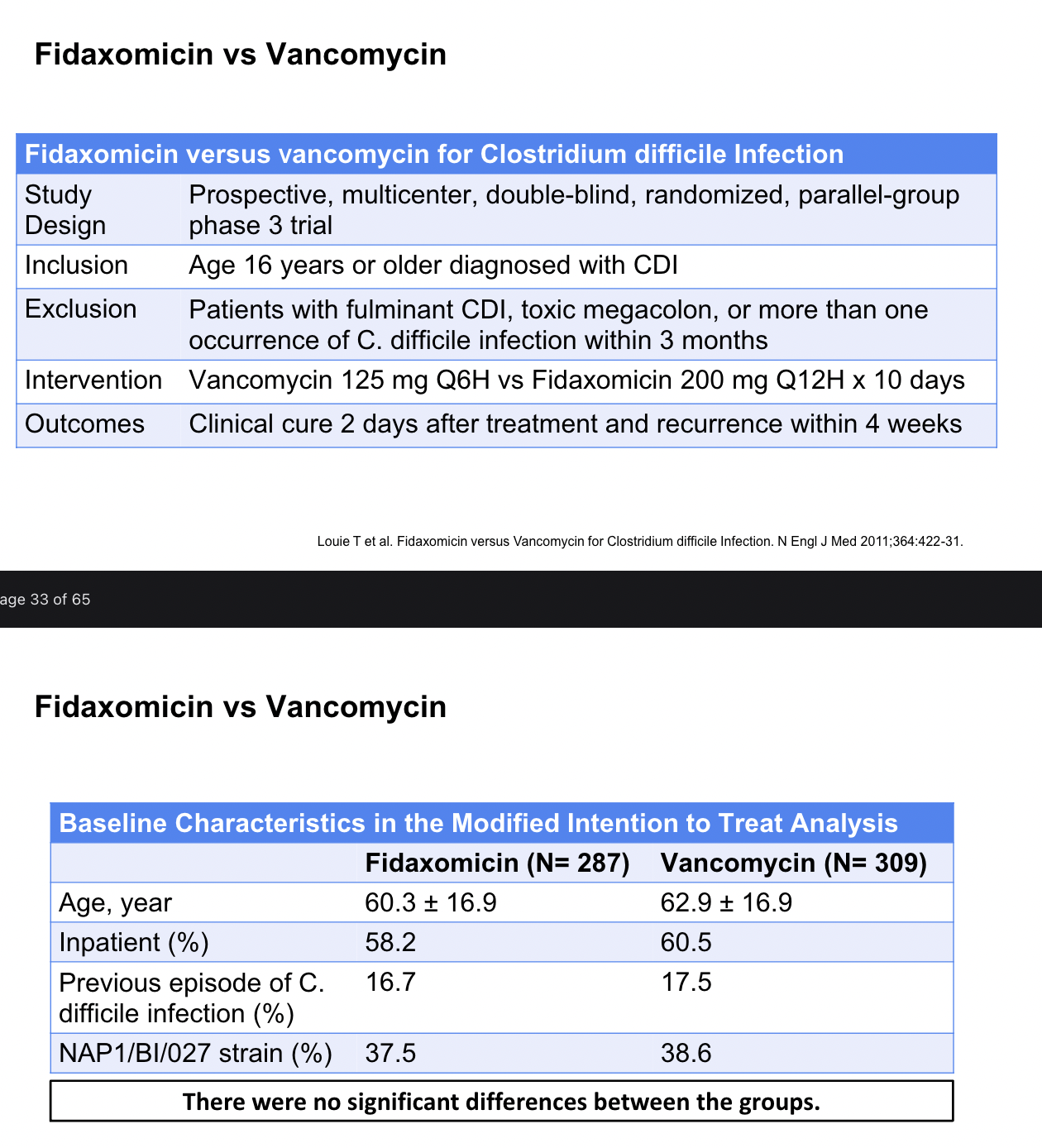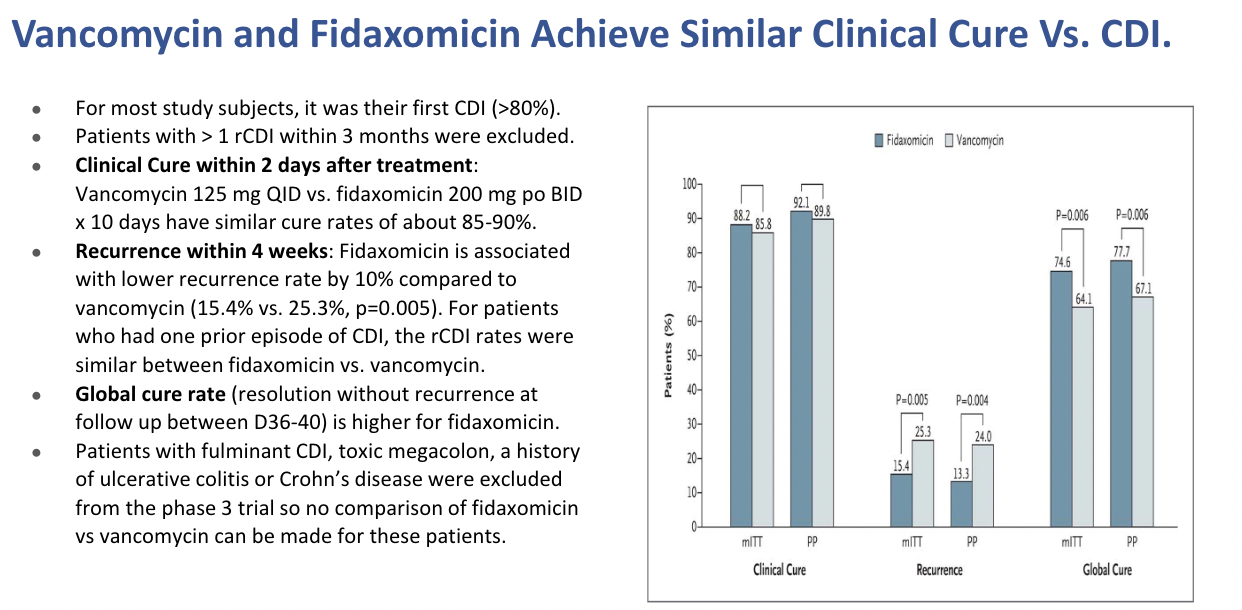 Go more into detail about how vanco and fidaxomicin achieve similar clinical cure vs CDI