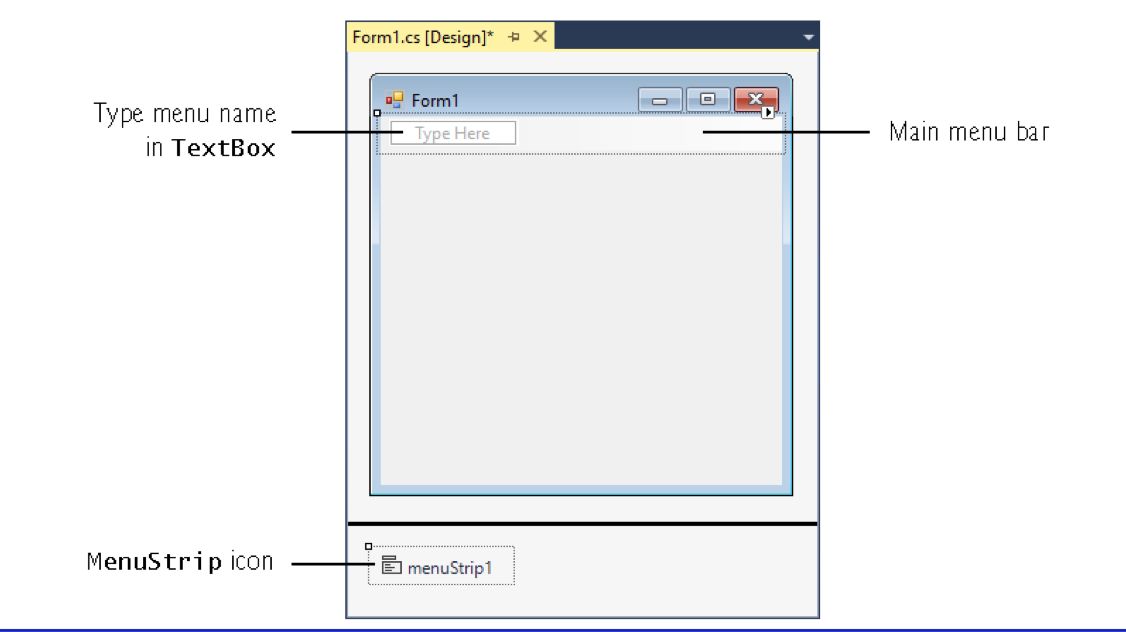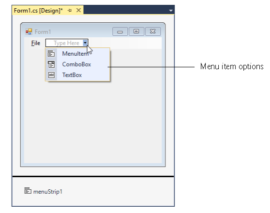 To create a menu, open the toolbox and drag a menustrip control onto the form. To add menu items to the menu, click the type here textbox and type the menu item’s name.