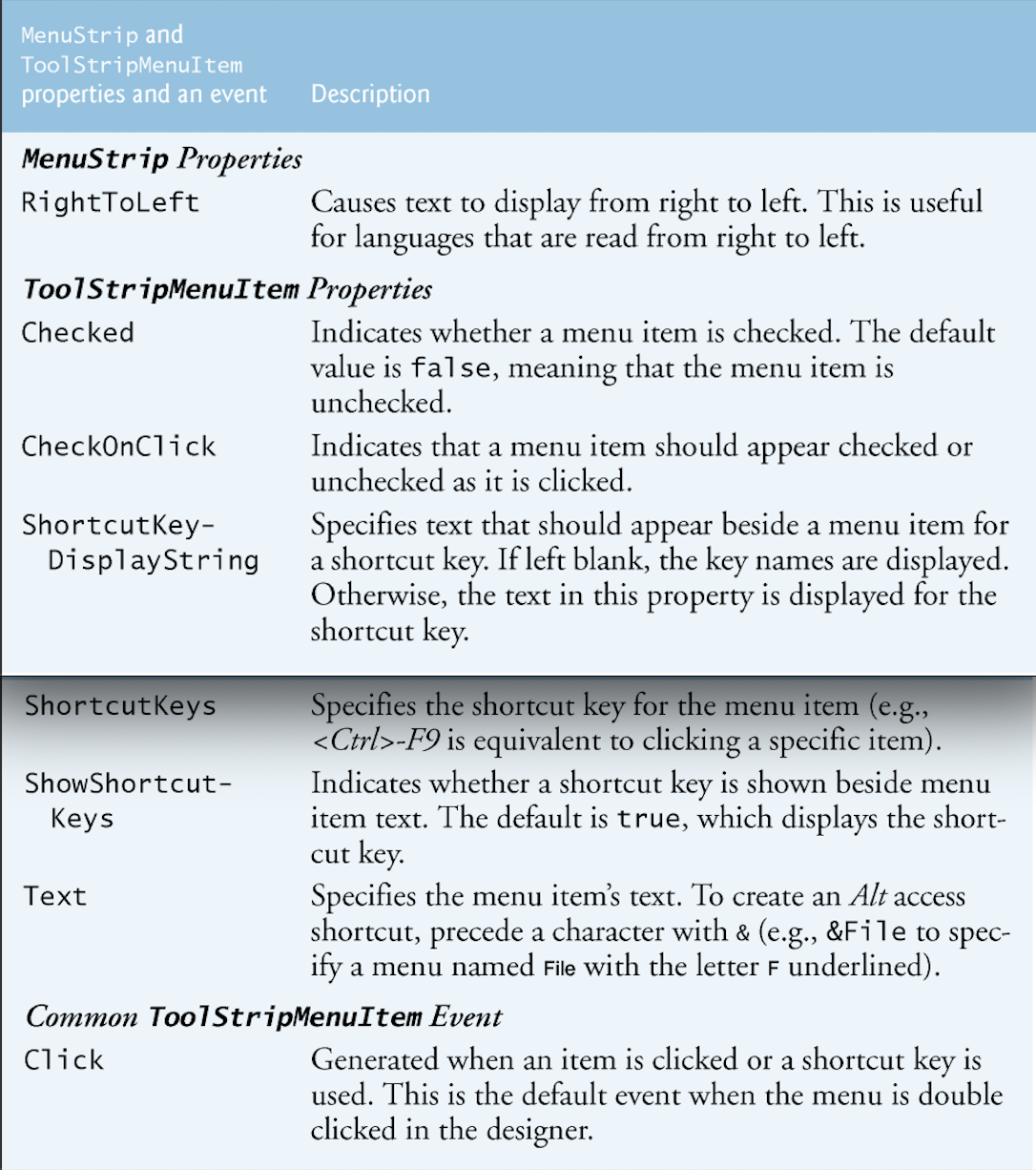 What are the common menustrip and toolstrip properties and events?