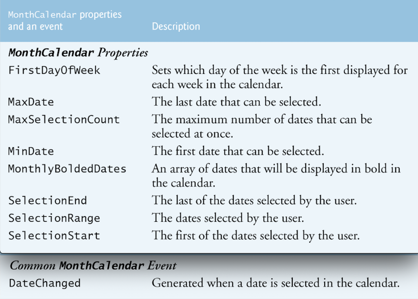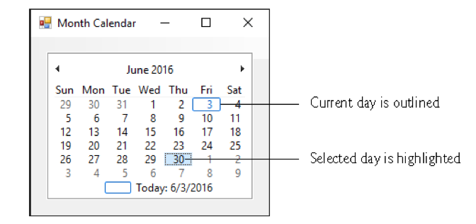 The MonthCalendar control displays a monthly calendar on the form. Multiple dates can be selected by clicking dates on the calendar while holding down the shift key.
