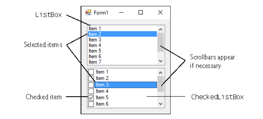 The listbox control allows the user to view and select from multiple items in a list. The checked list box control extends a listbox by including checkboxes next to each item in the list.