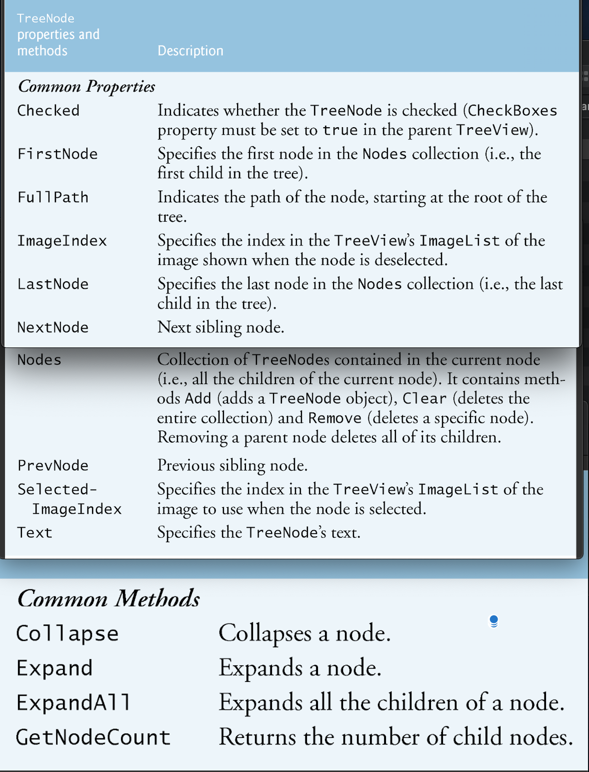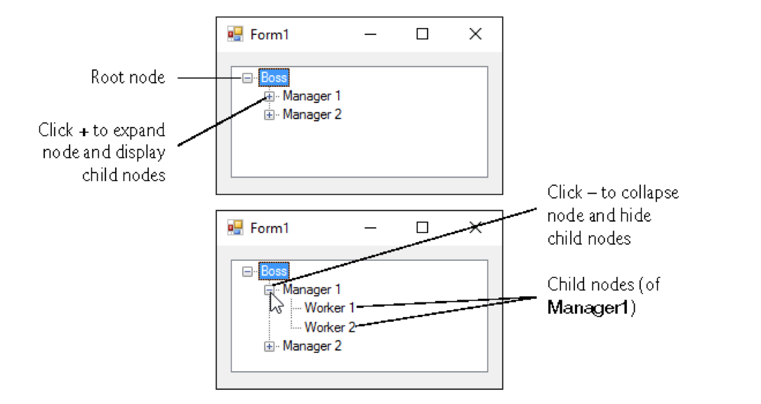 The treeview control displays nodes hierarchically in a tree. A parent node contains chil nodes, and the child nodes can be parents to other nodes. The two child nodes that have the same parent node are considered sibling nodes. The first parent node of a tree is the root node ( a treeview can have multiple roots)