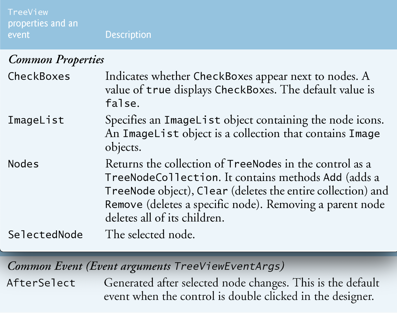 What are the common tree node properties and default Event?