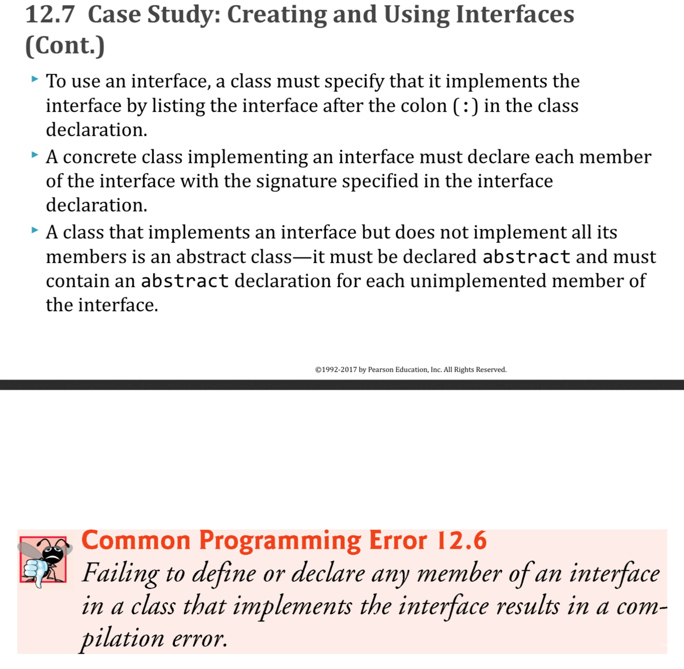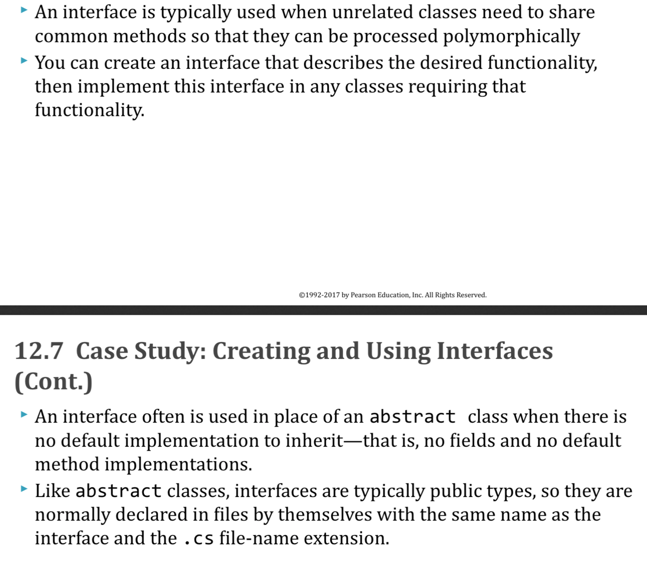 An interface explains adjectives (searchable, edible) and can group unrelate objects. Abstract classes still use the “is a” relationship and are nouns (shape, mammal)